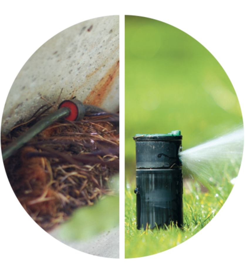 Sistemas de irrigação automática com aspersor tipo rotor para gramados e de gotejamento para jardins verticais.