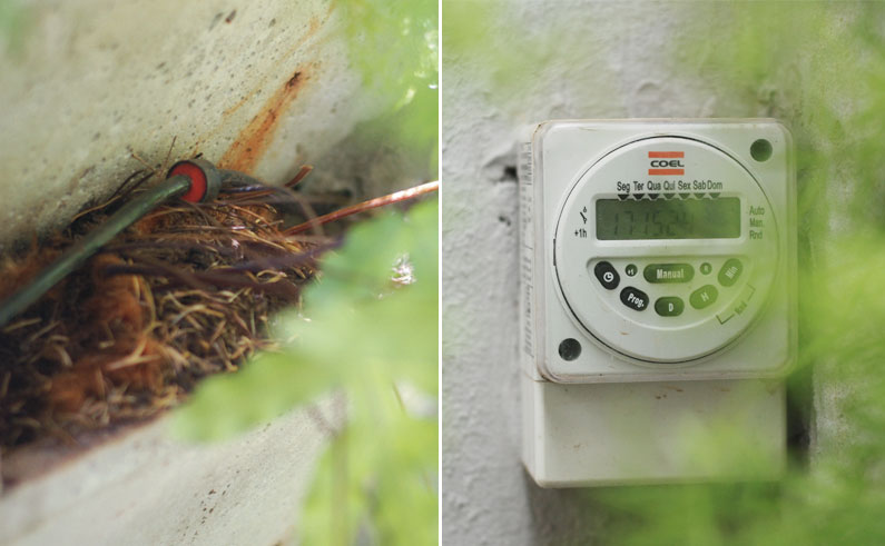 Sistema automático de irrigação para jardins verticais por gotejamento. Inclui timer programável e bomba.